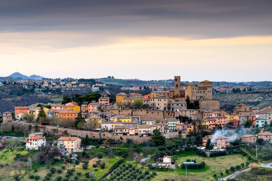Panorama of the medieval village of Longiano in the Emilia Romagna hills near Cesena in Italy, Europe.