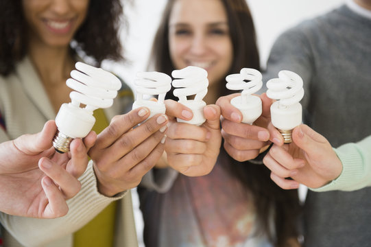 Friends holding fluorescent light bulbs