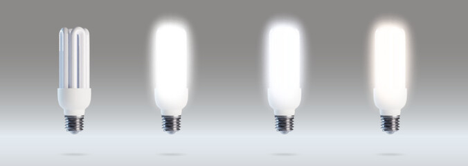 Compact fluorescent lamps set isolated on background. Vector realistic illustration of switched on and off cfl light with shadow, energy saving home or office illumination equipment, modern technology
