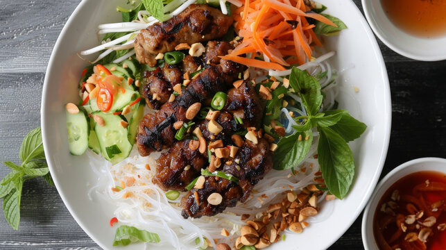 Traditional oriental cuisine of  Vietnam. Bun cha rice noodles with meat steak and bean sprouts