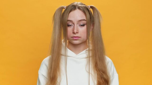 What? Gesture Confused Young teen girl shows emotion. Spreading his hands in front of camera with chagrin on yellow background. Fashion. Monotone. Emotions People. Lifestyle
