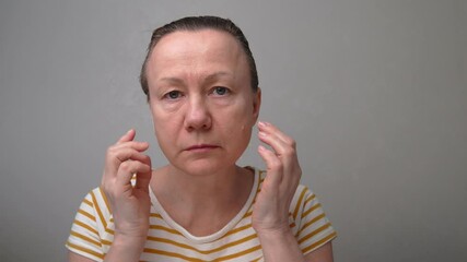 50-55-year-old woman looks with chagrin at her face with wrinkles, puffiness, and flabby skin. Age-related changes and fatigue. A woman is planning anti-aging procedures or plastic surgery