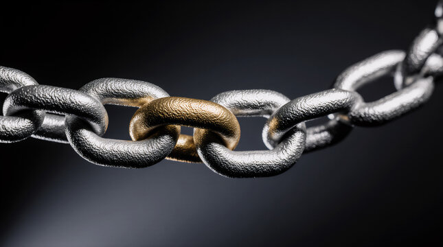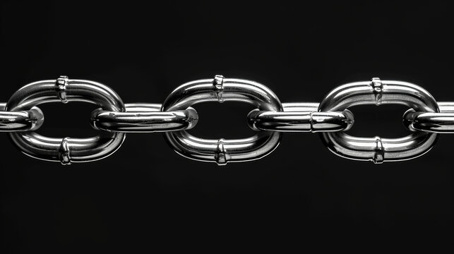Close-up of a metallic chain link on a black background. Strength and connection concept