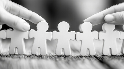 A row of brown paper cutouts shaped like human figures holding hands symbolizing unity and teamwork against a white background