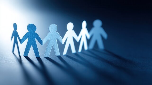 White paper cutout figures hold hands in a circular formation, symbolizing unity, teamwork, and togetherness on a blue background.