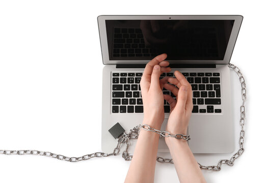Man businessman office worker chained to workplace computer. Concept slave work , overwork irregular working hours