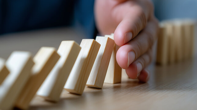 Hand stopping falling wooden domino pieces on table symbolizing control and prevention.