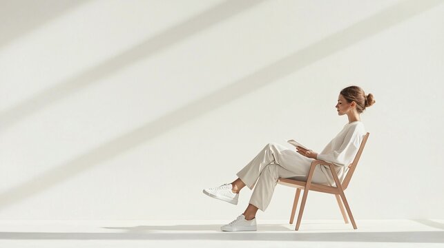 Person in neutral clothing sitting in a minimalist chair, side view, soft shadows.