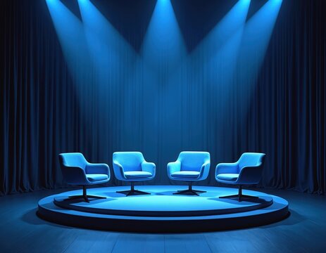 Four blue chairs arranged on circular stage under bright blue spotlights. Dark blue curtains form background. Setup ideal for interviews, talk shows, podcasts, presentations in modern media studio.
