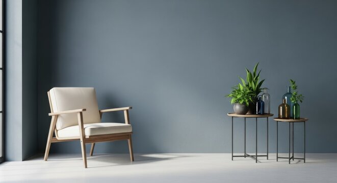 Minimalist interior with armchair side table and bookshelf near window. Empty room with chair and plants. Modern home decor, design and sunlight through large window.