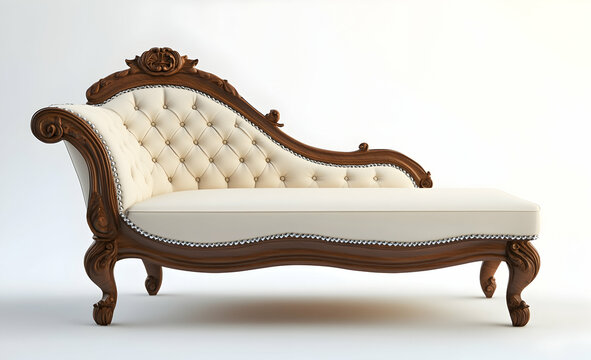 3D rendering of an elegant chaise longue with diamond buttons and a carved wood frame, isolated on a white background