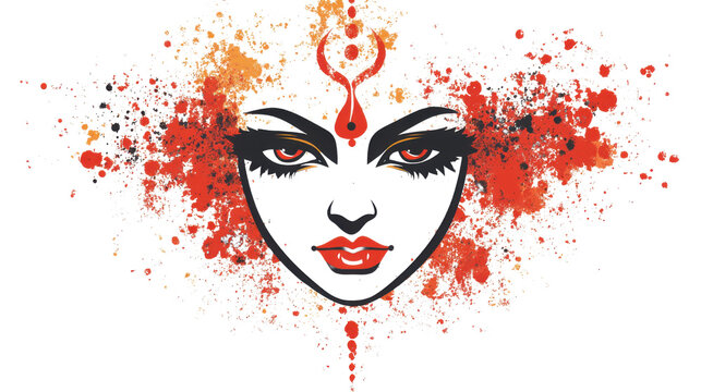 Chaitra Navratri poster painting, Goddess Durga's face in a full expression of courage and serenity, her sharp eyes shining with gold ornaments adorning her forehead