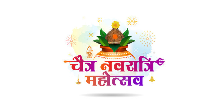 Ram navami puja. Kalash sthapana of chaitra navratri festival poster banner design. Indian hindi text with coconut kalash.