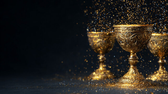 Ornate golden chalice overflowing with magical glitter on dark background. Luxurious and opulent fantasy scene representing celebration, success and ancient mystery