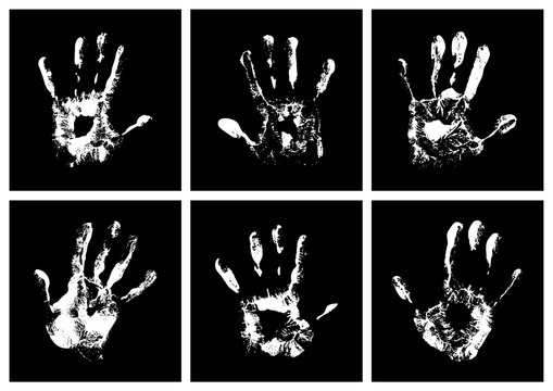 Set of vector white hand print on black background.