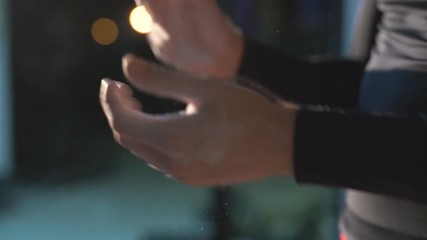 Close up of rock climber putting chalk on hands, claps hands