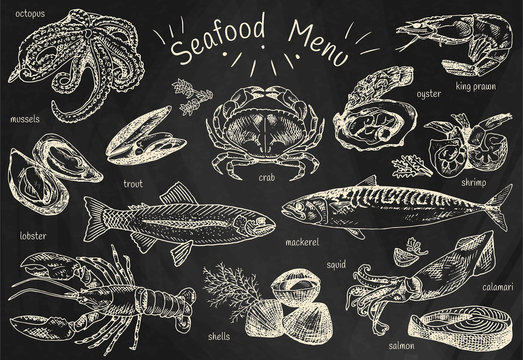 seafood menu, octopus, mussels, lobster, trout, shells, mackerel, crab, oyster, king prawns, shrimps, squid, salmon, calamari on chalkboard background