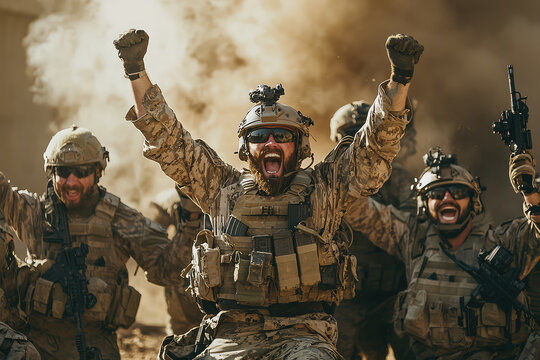 Celebrating Special Forces operators express joy and camaraderie in dynamic military scene. Their excitement and teamwork highlight bond formed in challenging situations