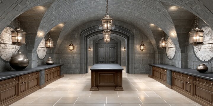 A dark chamber of trade with old world maps and glowing trade seals across empires