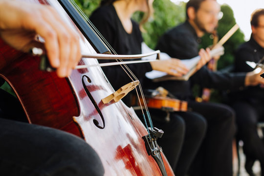 Cropped side view shot of unrecognizable female musician playing violin with chamber quartet on stage, focus on string instrument and bow