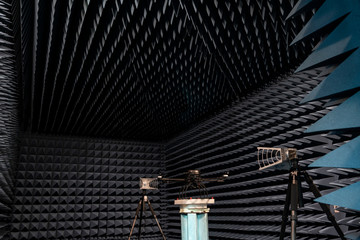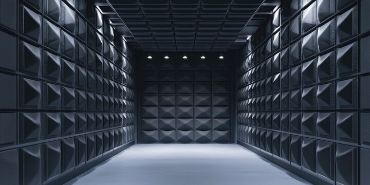 An industrial noise reduction chamber featuring sleek, sound-absorbing panels. The room provides a quiet and safe testing environment for engineers.