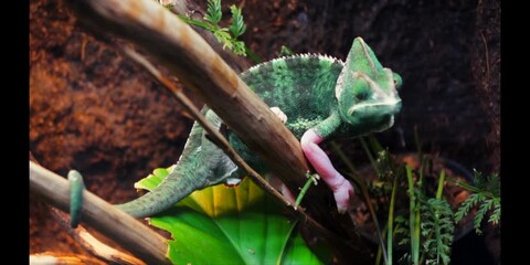 A green chameloen is perched on a branch in a cage that resembles a colorful rainforest.