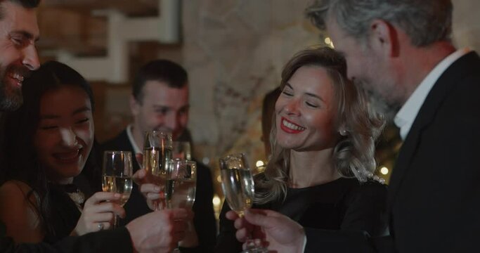 Stylish  Friends Clinking with Champagne and Celebrating Evening New Year Party