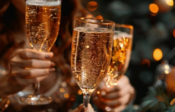 People toasting champagne glasses, celebrating new year's eve or Christmas holiday party, enjoying festive moments with friends, sparkling wine bubbles creating a joyful atmosphere