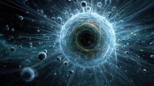 Futuristic visualization of quantum physics, with particles, waves, and light beams interwoven, representing the strange and infinite possibilities of quantum mechanics