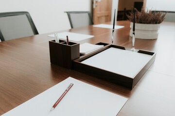 Ballpen and paper on conference table in office