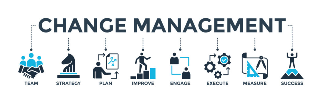 Change management banner for business transformation and organizational change with team, strategy, plan, improve, engage, execute, measure, and success icon. Web icon vector illustration