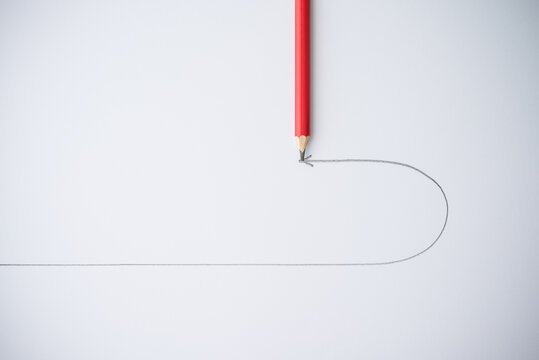 Flat lay of red pencil draw turning point arrow line on white background. Business, financial and education concept. Leader decide to change direction turning point to better way for success target.