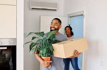 Young black couple moving into a new modern house, carrying boxes and arriving home together. Happy, excited and smiling husband and wife walking, entering and relocating after buying an apartment