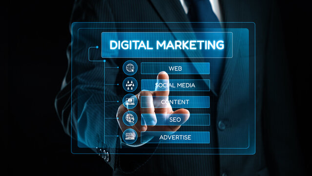 Digital marketing strategy broken down into categories: web, SEO, content, social media, and advertise. Digital tools enhance online marketing success across digital platforms. Elide