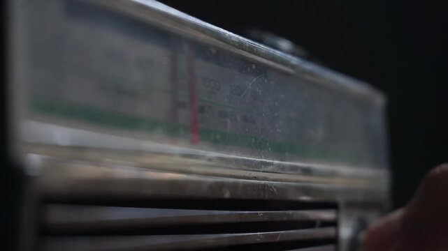 Adjusting frequency on a retro analog radio with the moving frequency bar clearly visible, showcasing vintage tuning interaction and signal search.