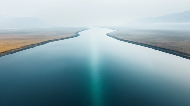 An aerial perspective showcases a man-made causeway separating two distinct bodies of water, one a vibrant turquoise and the other a deep blue.