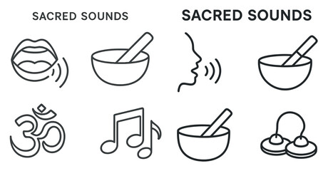 Sacred sounds outline icons set - linear, spiritual, meditation symbols