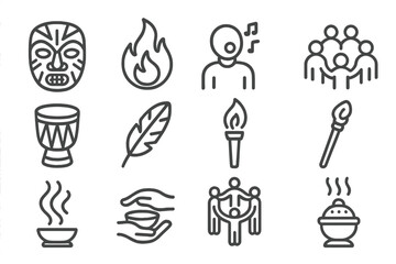 Indigenous Ceremony Icons. Line style icons of Indigenous Ceremony: Mask, Sacred Flame, Chant, Gathering; Drum, Torch, Feather,
