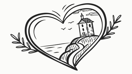 Detailed hand drawn heart outline framing a serene coastal chapel on a cliff overlooking the vast ocean, with a winding path and flying birds. Black and white sketch art.