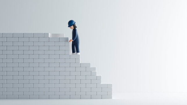 Blue cartoon character building a brick wall, long-term planning and foundation concept