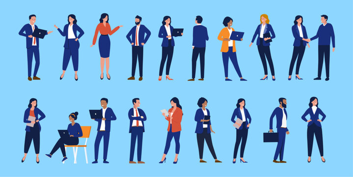 Businesspeople vector collection - Set of business and finance white collar characters standing, using computers, talking and working in flat design illustration with blue background