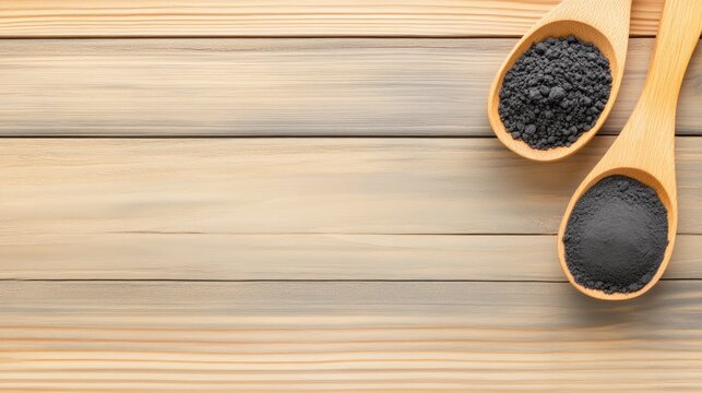 Two wooden spoons hold black powders against a light wooden background, showcasing a minimalist and natural aesthetic, sustainable living lifestyle.