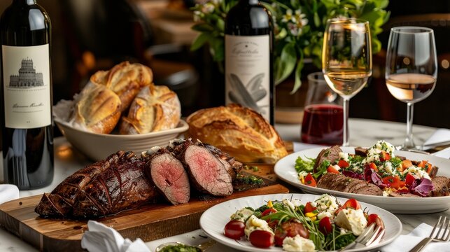 High-class cuisine displayed on an ornate table, featuring meticulously prepared dishes, artisan bread, and premium wine in a chic setting