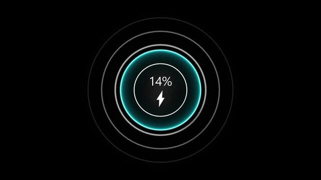 Neon loading animation counting from 0 to 22%, featuring a glowing green circle, and a charging connector on black background. Charging screen 22% percent, screen call phone display charging battery