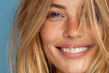 Close up portrait of a smiling woman with light skin, freckled cheeks, blue eyes, and tousled hair against a soft blue background, conveying warmth and natural beauty.