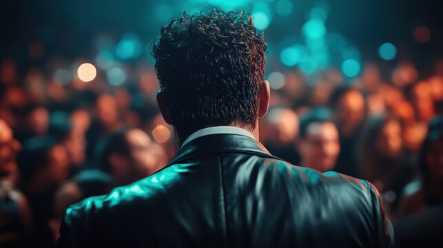 A charismatic performer stands with his back to the audience in a lively concert, creating an electrifying atmosphere filled with energy and excitement.