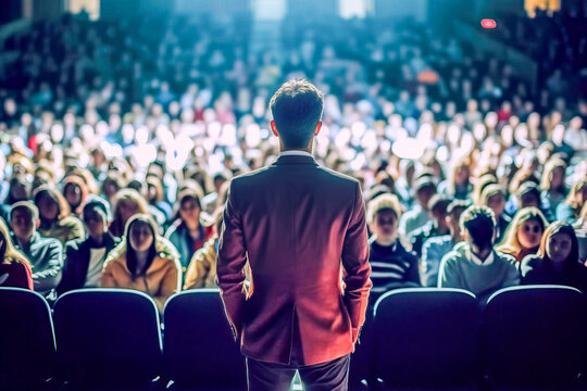 Back view of a confident and charismatic speaker addressing a diverse audience of business leaders at a global leadership