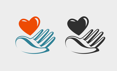 Hand holding red heart, icon or symbol. Love, charity, health, donation logo. Vector label