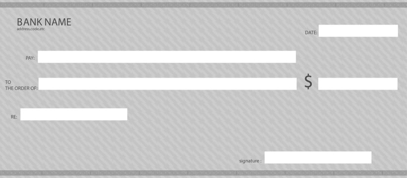 Bank check template. Checkbook page background with empty fields.