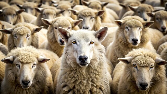 A wolf blends in with the flock, its true intentions concealed behind a disguise of sheep's clothing.